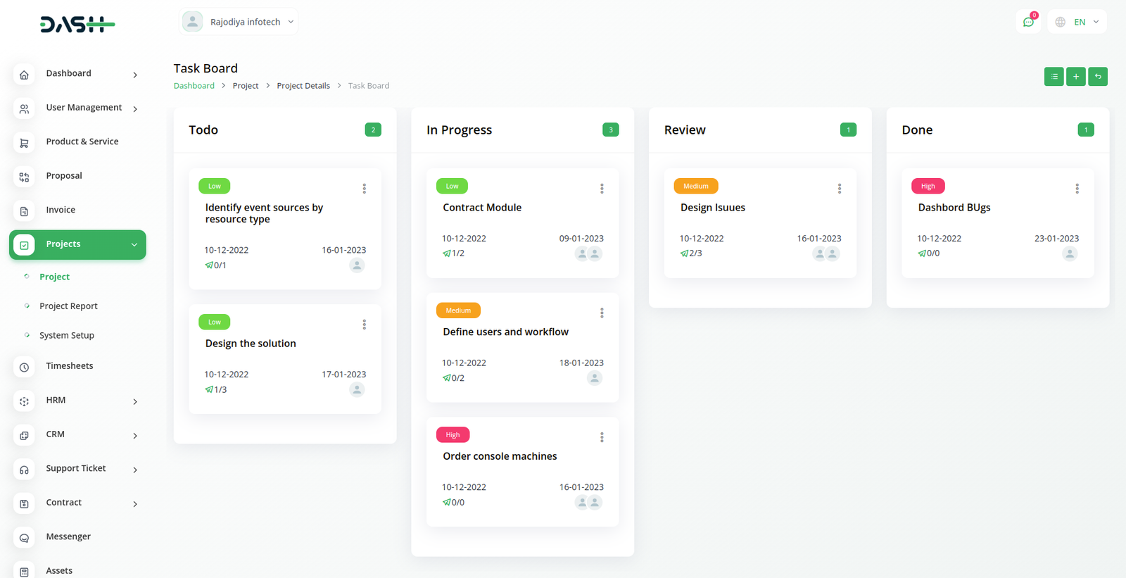 Get an overview of the total number of projects, tasks, bugs, and members. A visual representation of the task overview and project status can help you estimate the progress on each task. Lastly, you can check the top due task.